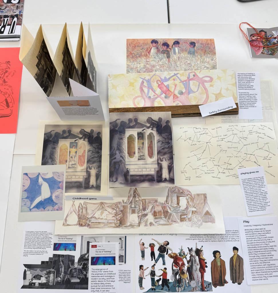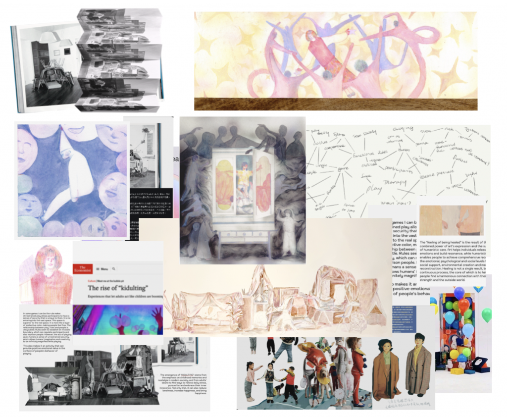 In the research results presentation, I focused on exploring the various connections between play and emotions. By visualizing the theme pictures and trying different ways of expression in the research, I wanted to construct a spatial narrative to build a personal experience between the theme and the audience.