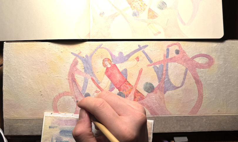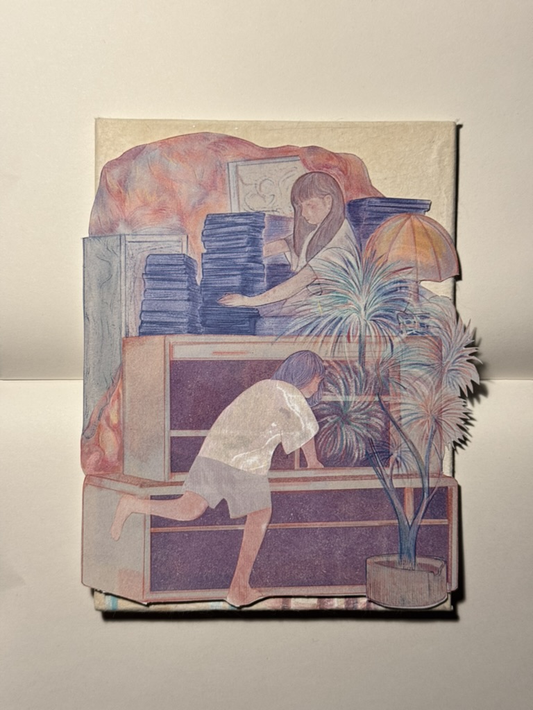 I tried gluing paper to the surface of the board. Create with watercolor. The combination of paper and wood allows me to be more flexible in both my drawings and layouts. Can be spliced arbitrarily. I think this can also combine the form of collage with painting to present a different spatial narrative.