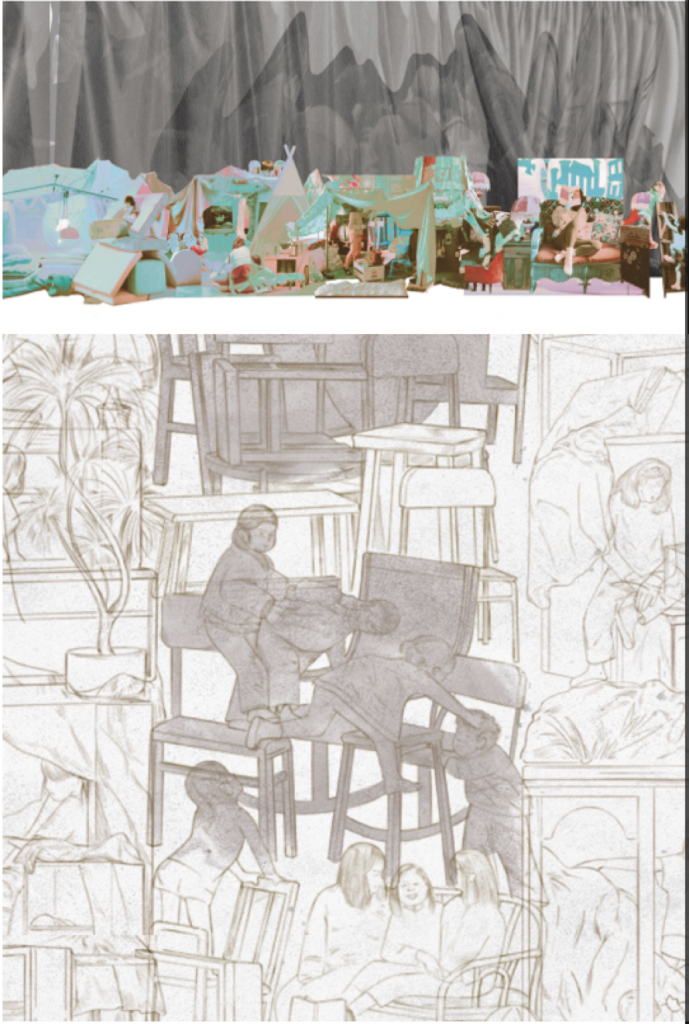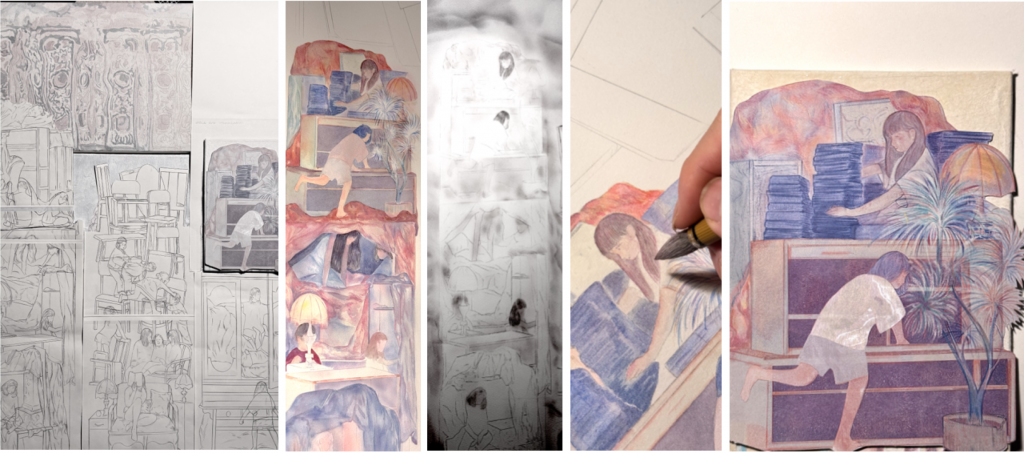 I created a long scroll based on my collage. I plan to use a combination of painting and digital painting to present the final image. I also try to create a narrative space through pop-up in some images.