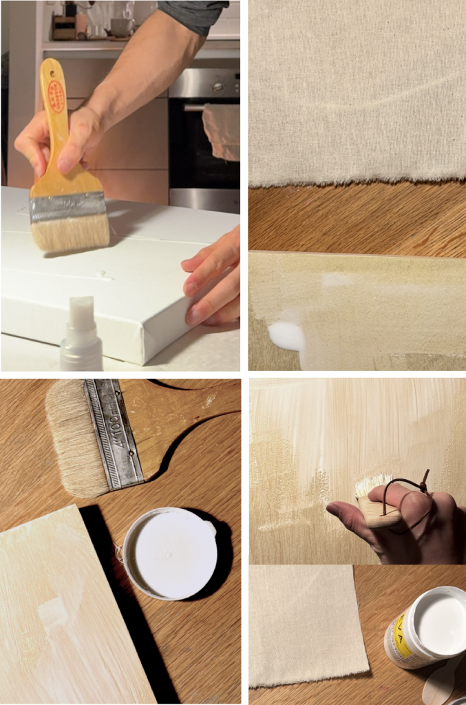 Then, using organic and water based glue to masking the linen canvas in to wooden frame.